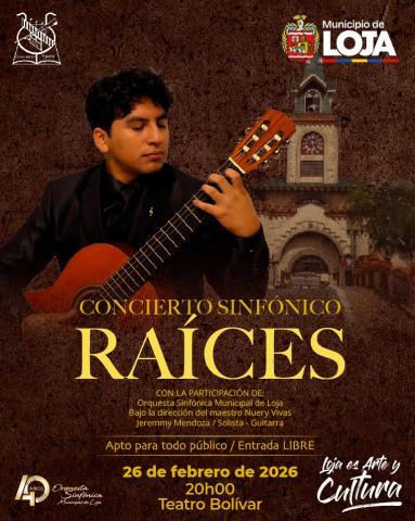 En el marco de la agenda "Loja es Arte y Cultura", el Municipio de Loja invita a la ciudadanía al magistral concierto sinfónico denominado "RAÍCES". El evento tendrá lugar este jueves 26 de febrero de 2026 a las 20h00 en el emblemático Teatro Bolívar.